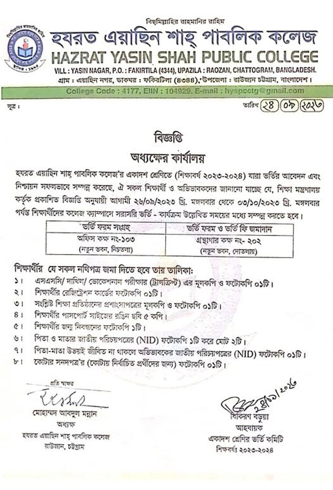 একাদশ শ্রেণি কলেজ ভর্তি'র নোটিশ শিক্ষাবর্ষ: ২০২৩-২০২৪